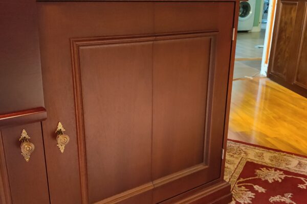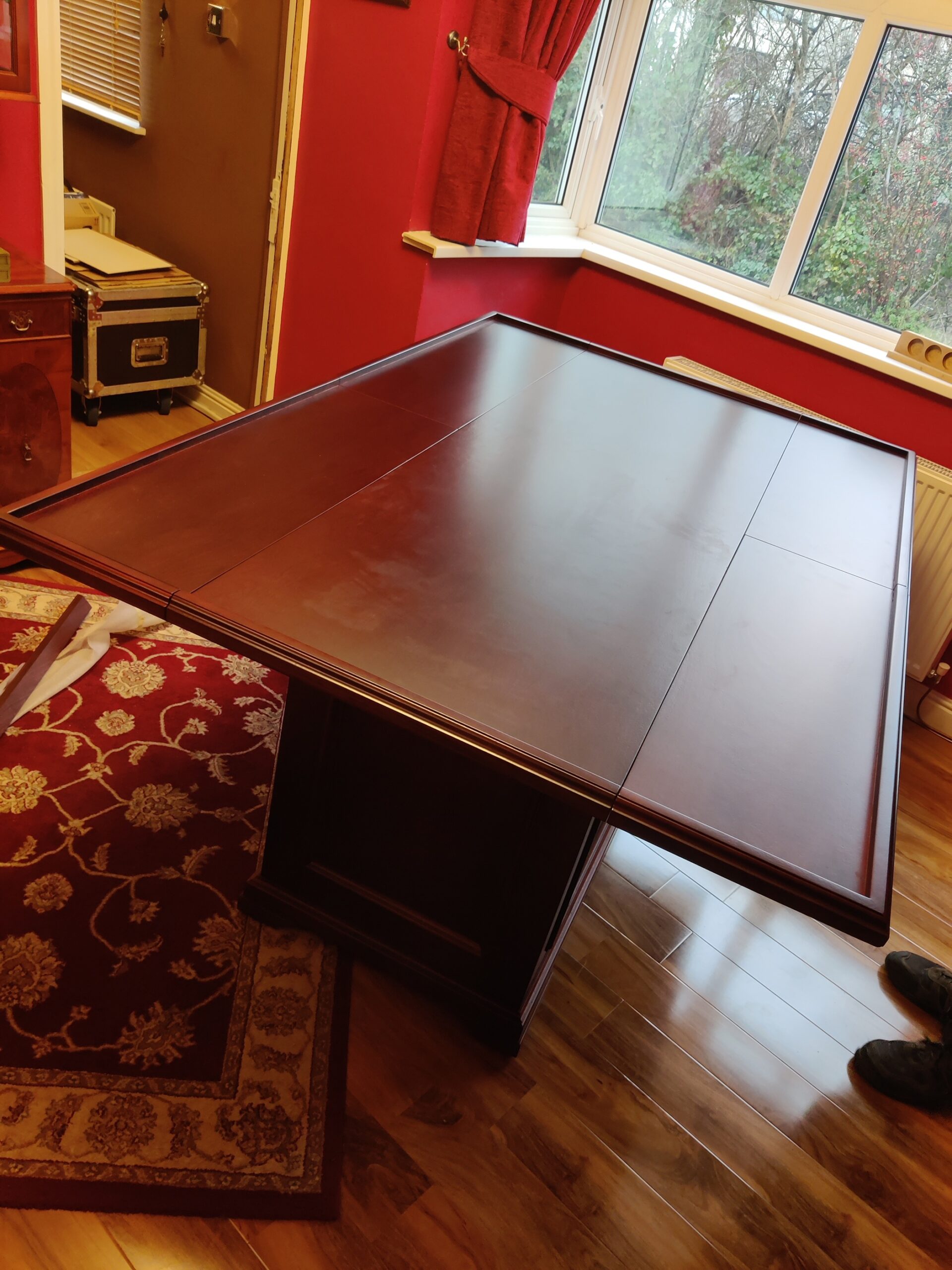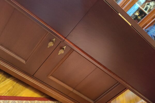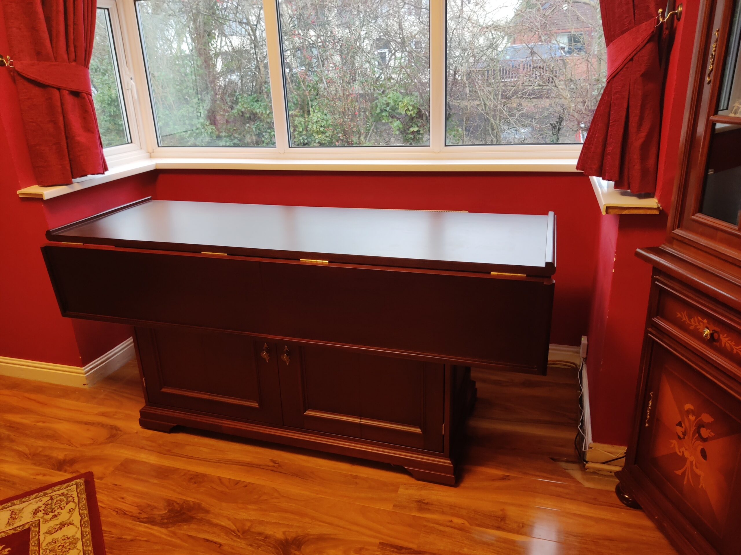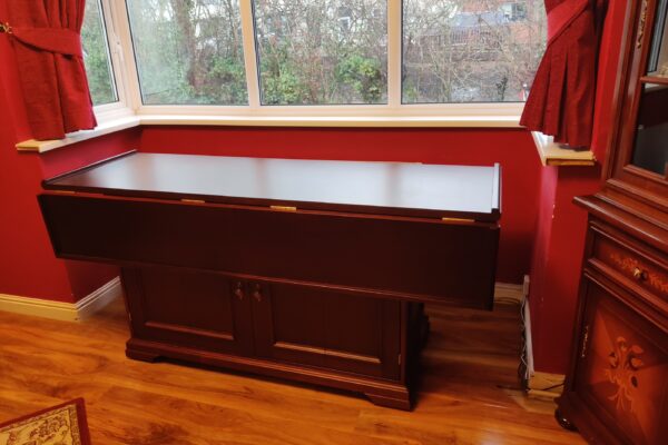 Crafted using mahogany veneered MDF with solid mahogany mouldings, the table was finished with a stain and lacquer carefully selected to complement the client’s existing furniture. Traditional detailing, including decorative handles, ties the piece seamlessly into the room’s established aesthetic.