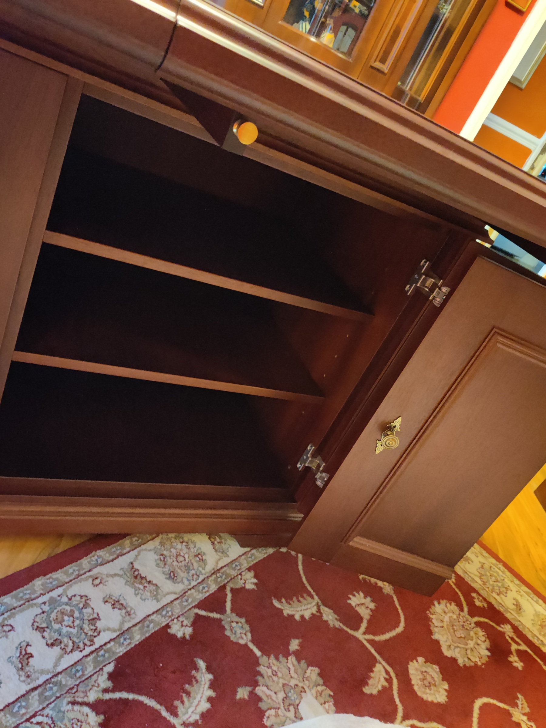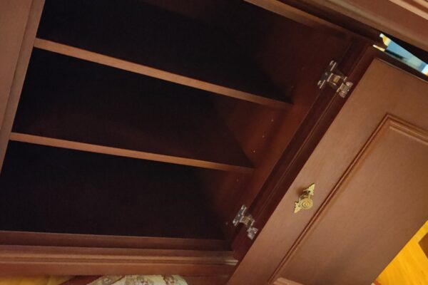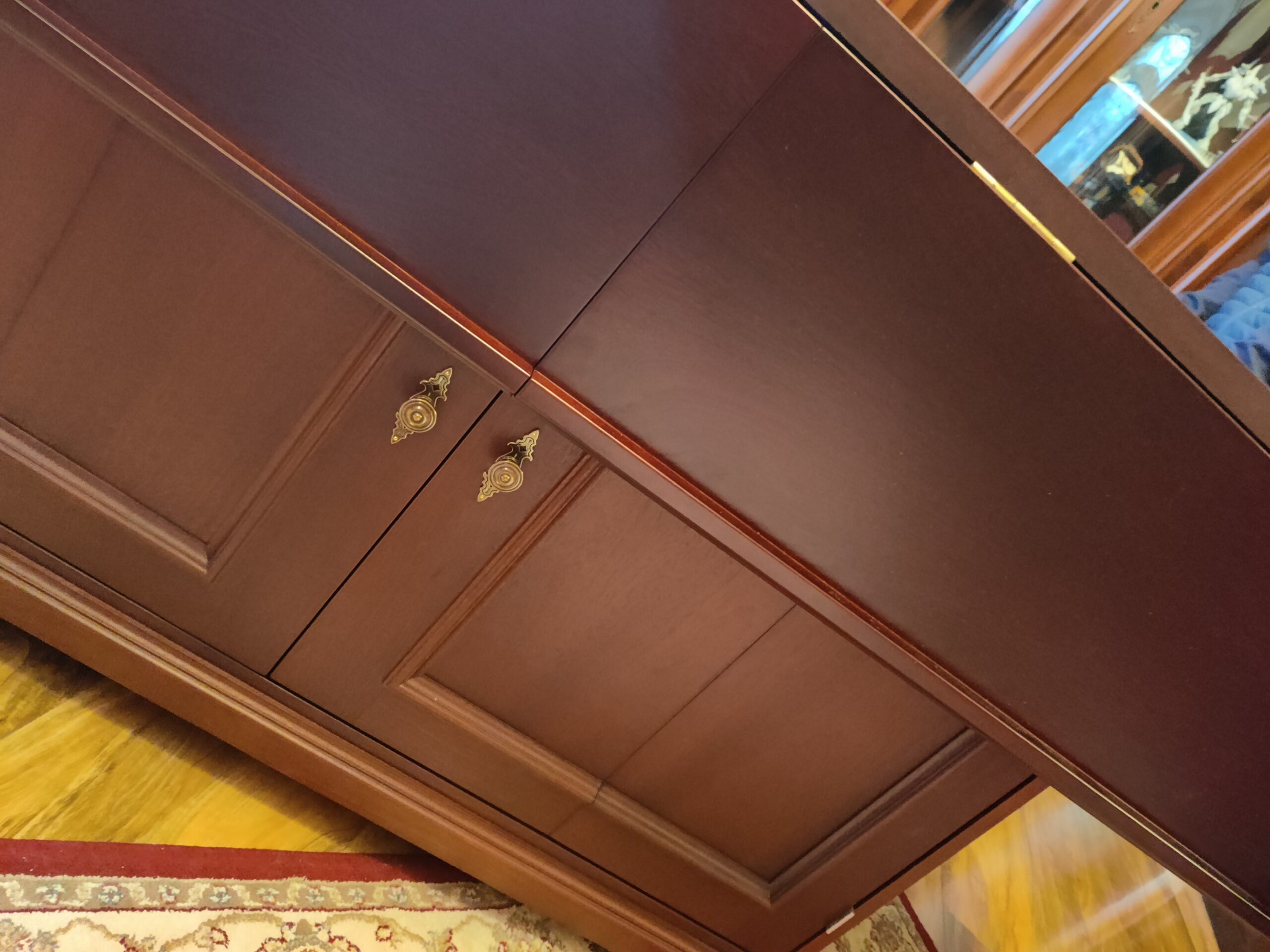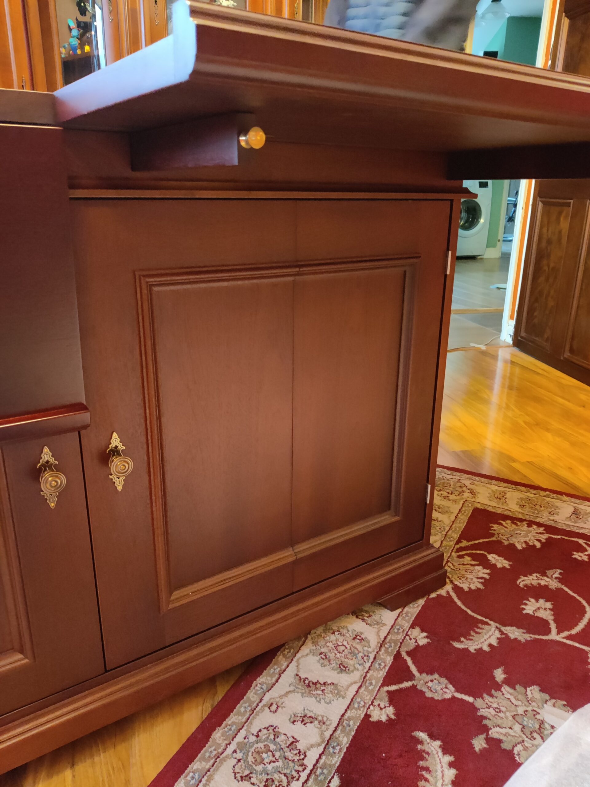 Crafted using mahogany veneered MDF with solid mahogany mouldings, the table was finished with a stain and lacquer carefully selected to complement the client’s existing furniture. Traditional detailing, including decorative handles, ties the piece seamlessly into the room’s established aesthetic.