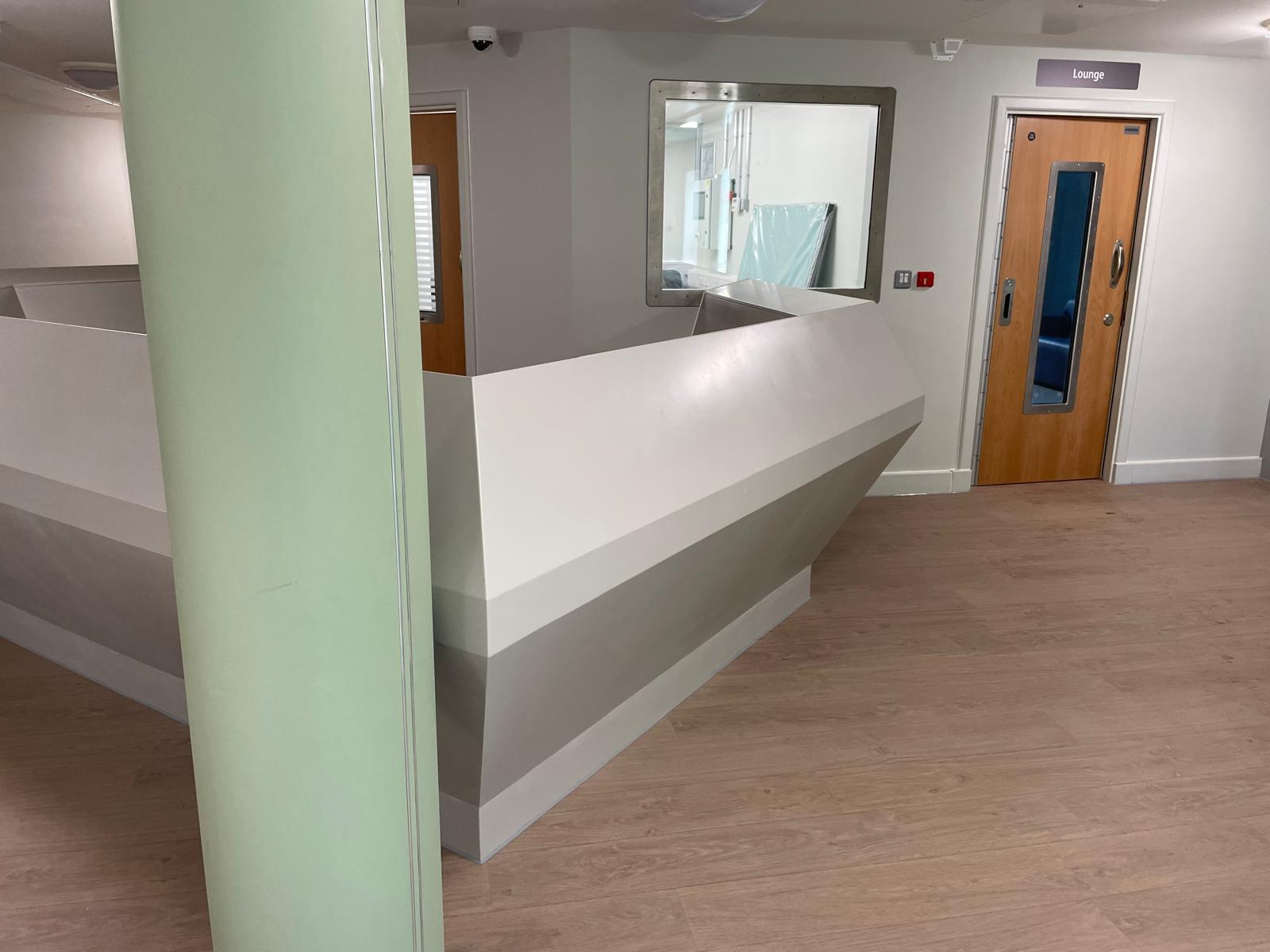 - Seamless Solid-Surface Finish – After the frame passed a trial fit on site (crucial, since once the solid surface was applied any corrections would have been extremely difficult), we partnered with Ideal Surfaces (Hinckley) to apply the solid surface cladding with seamless joints, ensuring that the final finish was hygienic, seamless and suitable for a hospital environment.